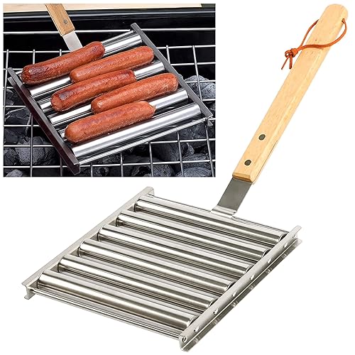KAYCROWN Varmkorv rack med extra långt trähandtag, BBQ griller för jämnt kokta hundar, 5 kapacitet, silver
