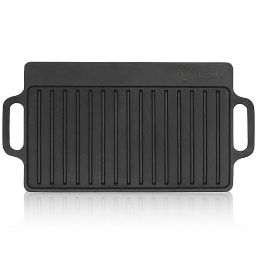 OVERMONT Gjutjärnsplatta, grillplatta, gjutjärn, dubbelsidig – grill med handtag 43,2 x 24,9 cm – för grill, spis, träkolgrill, gasgrill