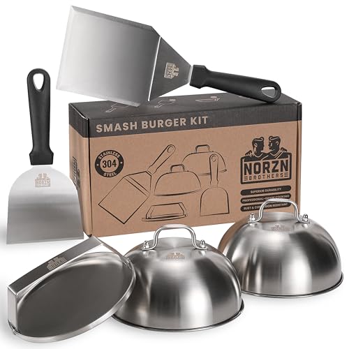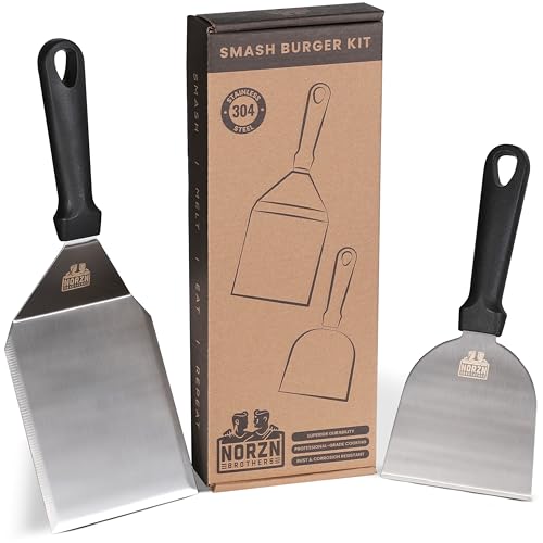 Norzn Brothers® Smash Burger Set – Inkluderar Smashjärn, Grillspade, Ostkupa, Stekpress, Köttpress – Tillverkad i 304 Rostfritt Stål, Godkänd för livsmedelskontakt, 10 Års Garanti