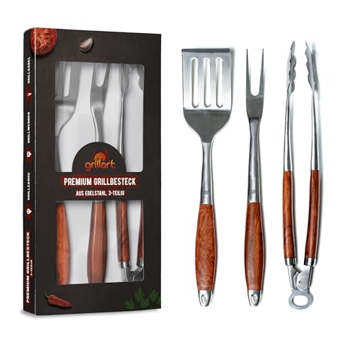Grillart® Premium grillbestick-set, 3 delar av högkvalitativt rostfritt stål och ädla trähandtag – grilltänger, grillspade och grillgaffel med extra långt handtag – det perfekta grilltillbehöret