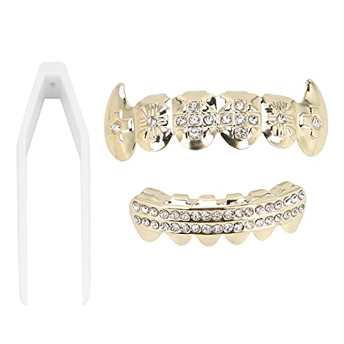 Grillar för Dina Tänder, Elektroplatta Hip Hop Falska Tänder Set, Topp och Botten Vampyr Fangs Grillz, Återanvändbar Ofärgad Halloween Festival Tänder Dekorationsstöd för Kvinnor Män Barn(guld-)