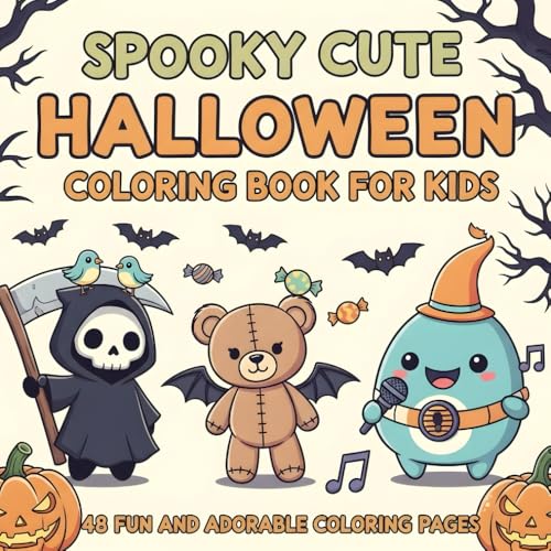 Spooky Cute Halloween Coloring Book for Kids: 48 Fun & Adorable Coloring Pages with Kawaii Grim Reaper, Teddy Bear, and Musical Characters for Boys and Girls
