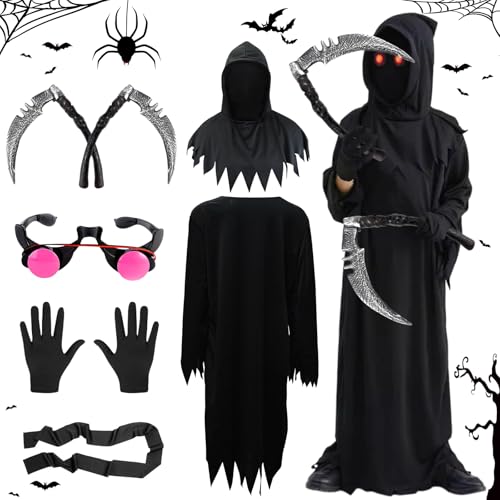 AEYAKA Sensenmansdräkt barn – lysande Grim Reaper Halloween-outfit för pojkar och flickor – läskigt utklädningsset för karneval och halloween