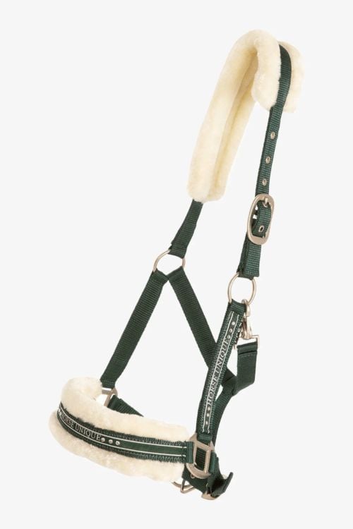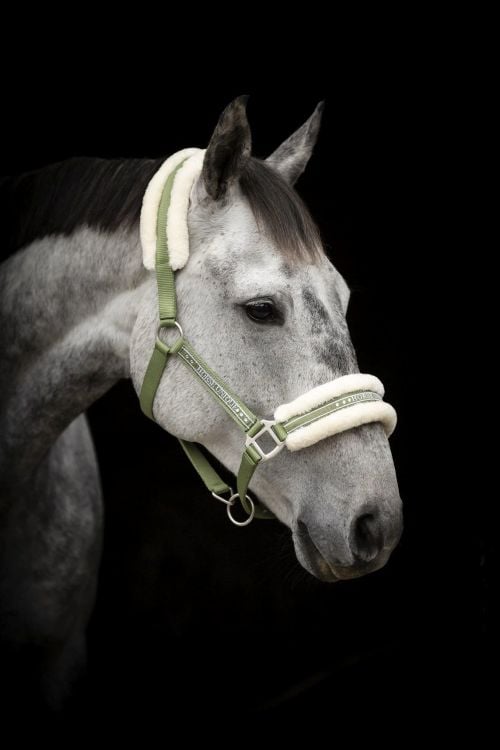 Imperial Riding Grimma IRHJewel – glamorös skalhållare med fuskpälstoppning och strass, justerbar, bekväm hästhållare för stall, träning och vide, olivgrön, full