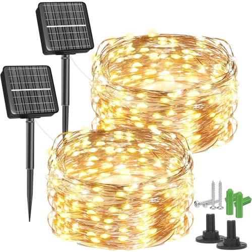 2 stycken x 12 m solljuskedja utomhus, 120 LED 8 ljuslägen koppartråd solljuskedja, belysning utomhus dekoration väderbeständig för trädgård, träd, balkong, terrass, grind, gård, jul (varmvit)