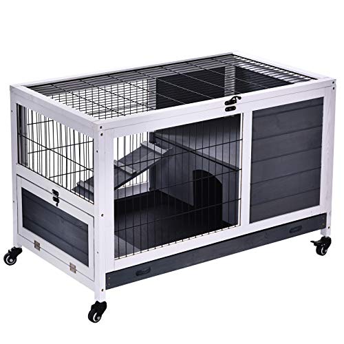 PawHut kaninklammer på hjul kaninbur 2 våningar låsbar dörr öppningsdörr, glidande bricka grind, grå vit