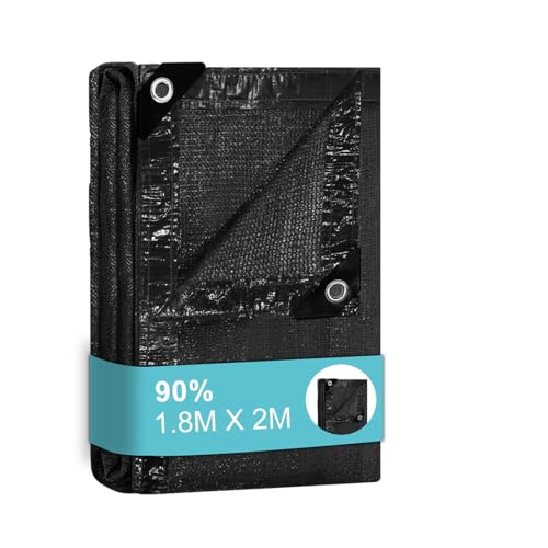 BeGrit Skuggnät för växthus med genomföringar, 90 % skuggningsfrekvens, UV-beständigt, solskyddstyg med bungee-bollar för trädgård, blomma, växt, svart (1,8 m x 2,0 m)