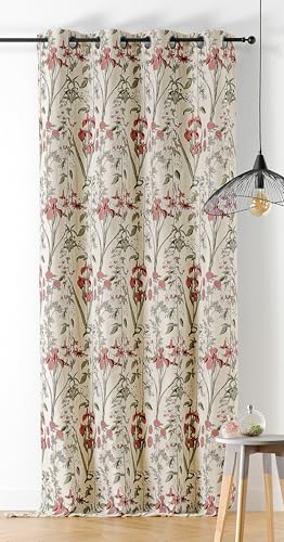 LINDER - Vävd och färgad gardin i Frankrike - blommig stil gardin - gevärskanne färg öljetter - granatröd, grön och ecru färg - mått 140 x 260 cm - Iberis kollektion