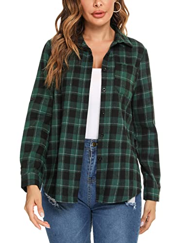 Enjoyoself dam, rutig blus, långärmad, rutiga flanellskjortor, 100 % bomull, button-down skjortblus för vardag och oktoberfest, Brun+grön, M