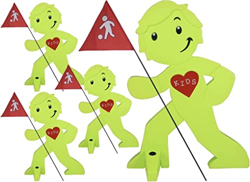 StreetBuddy - Varningsfigur med flagga, reflekterande varningsstativ för barnsäkerhet – observera långsam körning – försiktighet leker barn – skylt bilförare varning – set (grön, förpackning med 4)