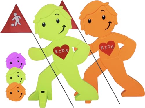 StreetBuddy – varningsfigur med flagga, reflekterande varningsstativ för barnsäkerhet – observera att köra långsamt – varningslekande barn – skylt för bilförare (1x grön, 1 x orange)