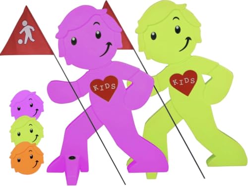 StreetBuddy – varningsfigur med flagga, reflekterande varningsstativ för barnsäkerhet – observera att köra långsamt – varningslekande barn – skylt för bilförare (1x magenta, 1 x grön)