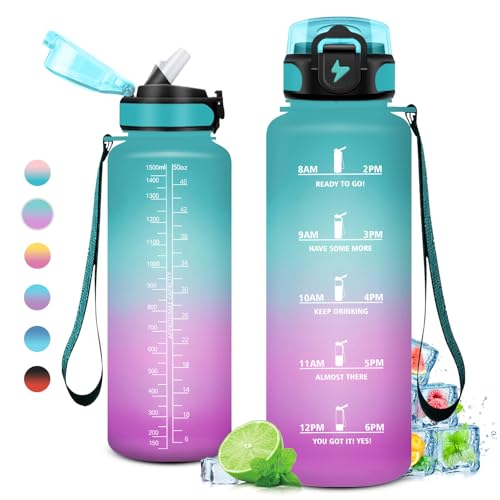 1,5 l vattenflaska, gymflaska med tider för att dricka, 1 klick öppen, läckagesäker, sportflaska, BPA-fri, vattenflaska med sugrör för gym, arbete, vandring, cykling