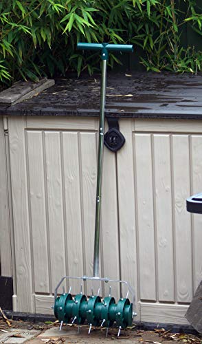 Gräsluftare rulle gräsmatta med handtag & 3 cm spik & stänkskydd 46 x 23 x 127 cm mörkgrön och silver