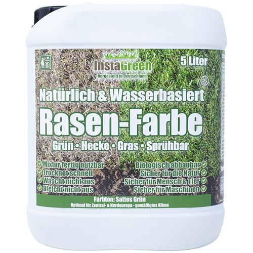 InstaGreen Premium bak- och gräsfärg 5 liter – redo att användas gräsfärg för gräsmattor och häckar – gräsmatta lack mot gul gräsmatta – naturligt vattenbaserad spraybar biologiskt nedbrytbar