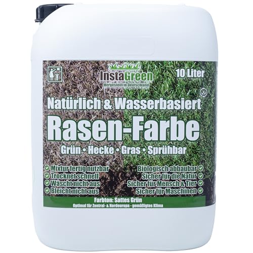 InstaGreen Premium bak- och gräsfärg 10 liter – redo att användas gräsfärg för gräsmattor och häckar – gräsmatta lack mot gul gräsmatta – naturligt vattenbaserad spraybar biologiskt nedbrytbar