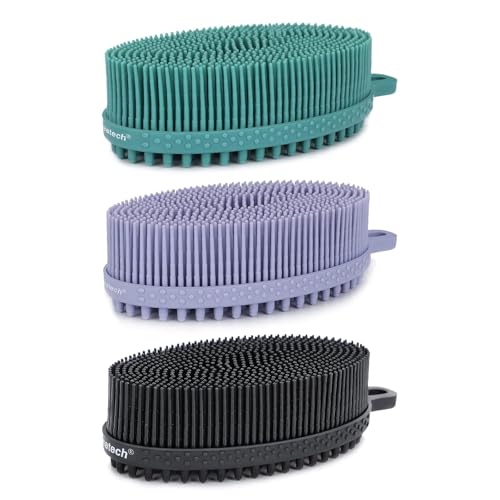 FREATECH 3 Pieces Silikonkroppsborste - Dubbelsidig Duschkroppsborste för Skonsam Peeling, Djuprengöring och Intensiv Massage, Vård för Känslig Hud, Mer Hygienisk och Hållbar, Svart & Lavendel & Grön