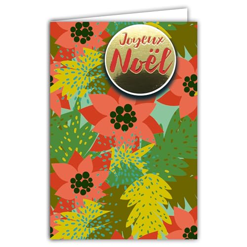 AFIE God jul kort glänsande textrelief collage med vitt kuvert 12 x 17,5 cm - julstjärna blommor grönt växtblad illustration bästa önskningar