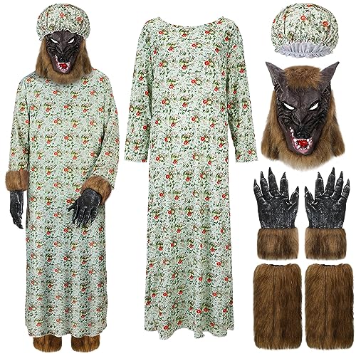 Bonuci halloween varg mormor kostym vuxen cosplay klänning outfit med hatt varg huvud mask handskar benvärmare för fest (grön)
