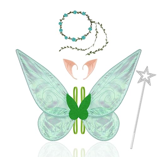 Aomig Fairy Wing, fjärilsvingar för barn, flickor, glittrande skira vingar med blommande pannband, tomteöron och Fairy Wand, Angel Wings Princess Fancy Dress Up-kostymer för Halloween-fest Cosplay