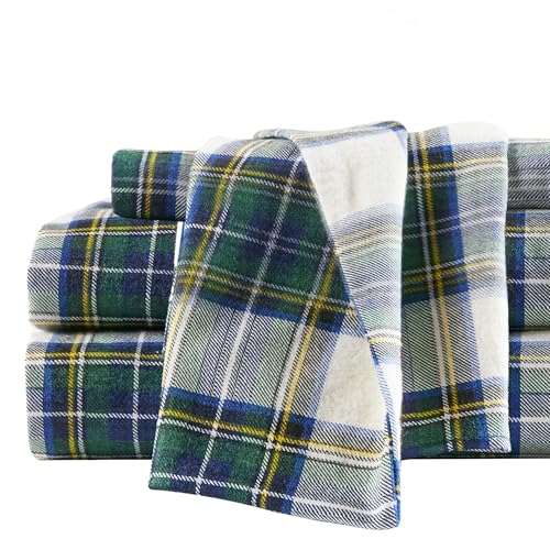 Comfort Spaces Bomullsflanell andningsbar varm djup ficka lakan med örngott sängkläder, drottning, grön pläd skotsk pläd 4 delar