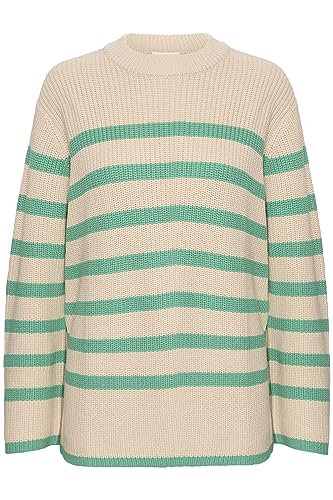 KAFFE Kvinnors tröja lös passform randig Crew Neck långärmad chunky ribbad stickning, Sanddollar/Calla Green, XXL