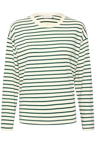 KAFFE Dam T-shirt med lång ärm Boxy Fit Crew Neck randig T-shirt bomull tröja dam, Antik vit/grön rand, XL