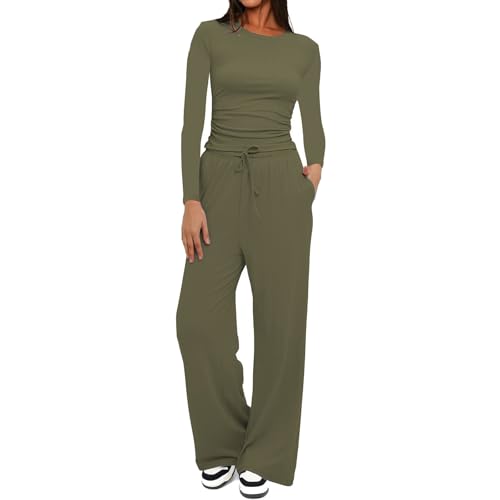 Träningsdräkt Dam Full Set Lounge Wear Sets Sweats Oversized Enfärgade Långärmade Skjortor Hög Midja Breda Ben Joggers Mysigt Mjuk Nattkläder Dailywear(Green,XL)