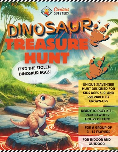 Dinosaur Treasure Hunt: Find the stolen dinosaur eggs! A unique scavenger hunt game for kids ages 5–9 prepared by grown-ups – Ready-to-play kit with 2 ... fun, for 3–12 players, indoors or outdoors.