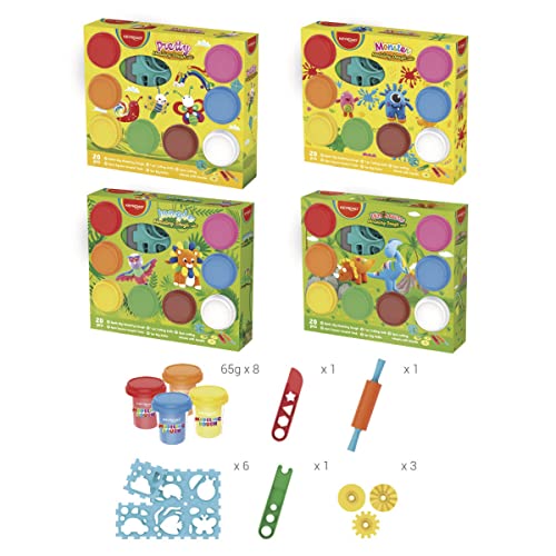 KeyRoad knådmassa leklera i grundfärger med knådtillbehör/4 x 65 g och 5 former och skoter/minilermassa för barn för pyssel och design/kreativt set för resor/barnsäker, giftfri