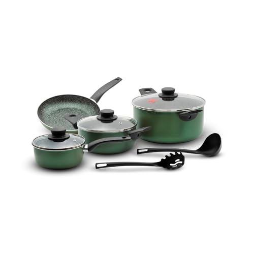 Batteri 9 delar – grytset med grytor och stekpanna, kropp av ren aluminium och non-stick, inklusive glaslock och soppskedar, tillverkad i Italien
