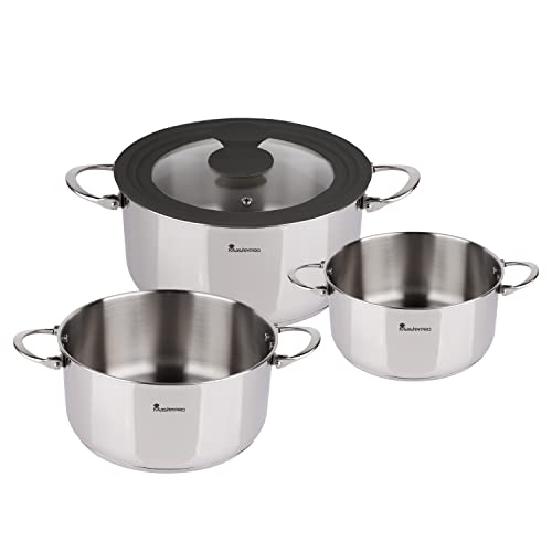 MasterPro Foodies | Grytset | 4-delat set med 16, 20 och 24 cm krukor och glaslock | Tillverkad av rostfritt stål | kastrullset | Lämplig för alla typer av spisar