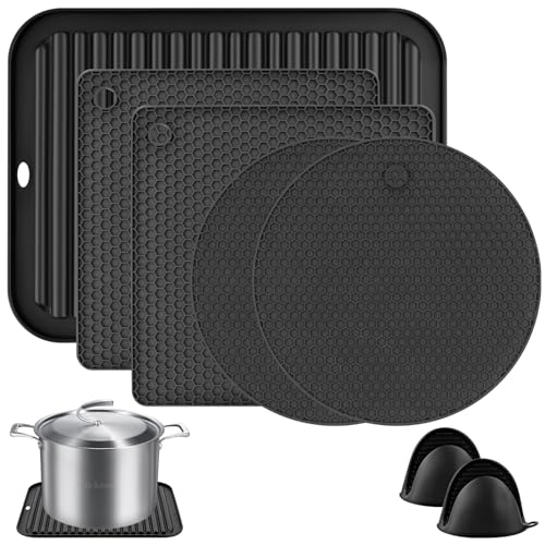 WuGU 7 stycken grytunderlägg silikon, kök silikon grytlappar set, multifunktionella kastrullunderlägg, värmebeständiga grytlappar diskmaskinståligt halkfritt bikakemönster (svart)