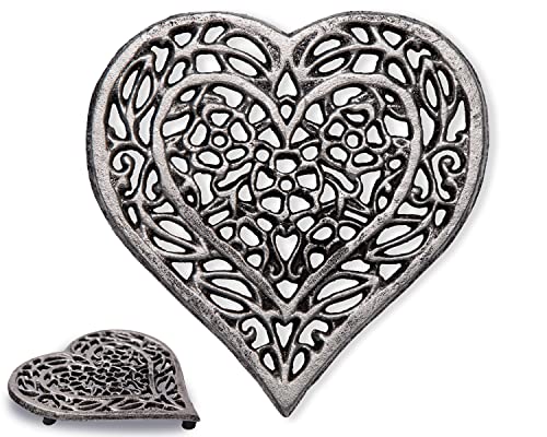 Gjutjärnshjärta grytunderlägg – Dekorativt gjutjärnsgrytunderlägg för kök eller matbord – vintage, rostig design – med gummipinnar/fötter – återvunnen metall – rost silver svart – av Comfify