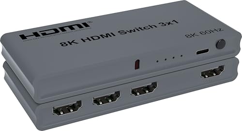 PremiumCord 8K HDMI 3:1-omkopplare med fjärrkontroll, 8K @ 60 Hz, 4K @ 144 Hz, Full HD 1080p, 40 Gbit/s, 3D, HDCP 2.3, VRR, ALLM, FreeSync, G-Sync, 5 V/1 A strömförsörjning, grå