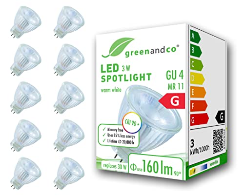 10x greenandco® CRI 90+ LED-spot ersätter 20W GU4 MR11 halogenstrålkastare, 3W 160lm 3000K varmvit 38° 12V AC/DC, flimmerfri, inte dimbar