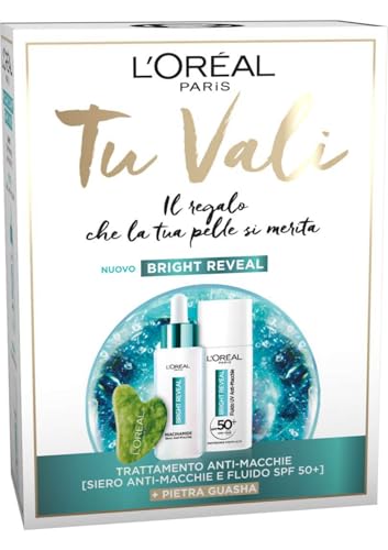 L'Oréal Paris Bright Reveal julbox med UV-vätska SPF50+, fläcksäkert serum och Gua Sha-sten, för alla hudtyper, reducerade fläckar och enhetliga hudfärger, 50 ml + 30 ml