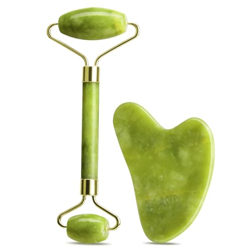 URAQT Gua Sha och Jade Roller Set, Jade Gua Sha Board and Face Roller Set, Quartz Jade Stone Gua Sha ansiktsverktyg, ansiktsskrapande massageapparat, Anti-aging massage skönhetsverktyg (grön)