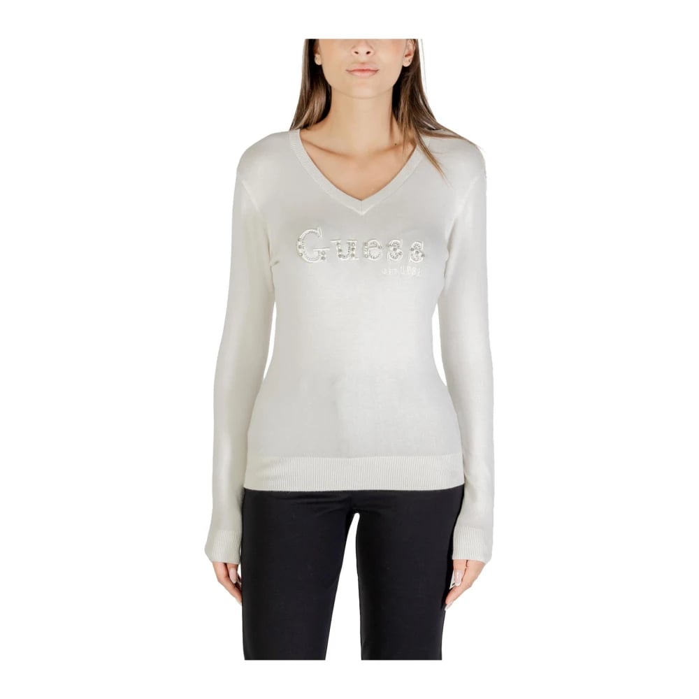 Guess, Stickade Tröjor , Dam, XL, Vit V-ringad Stickat för Höst/Vinter