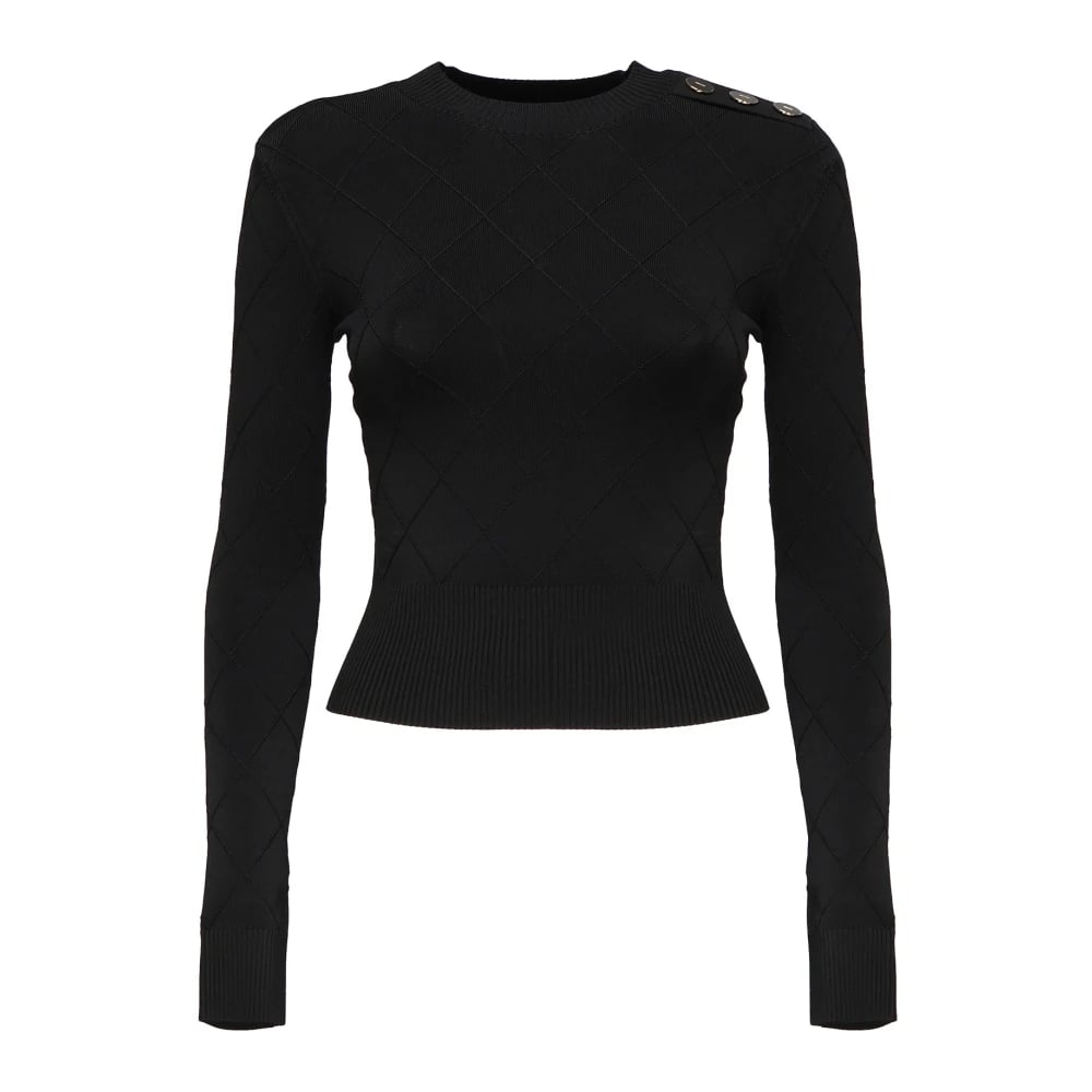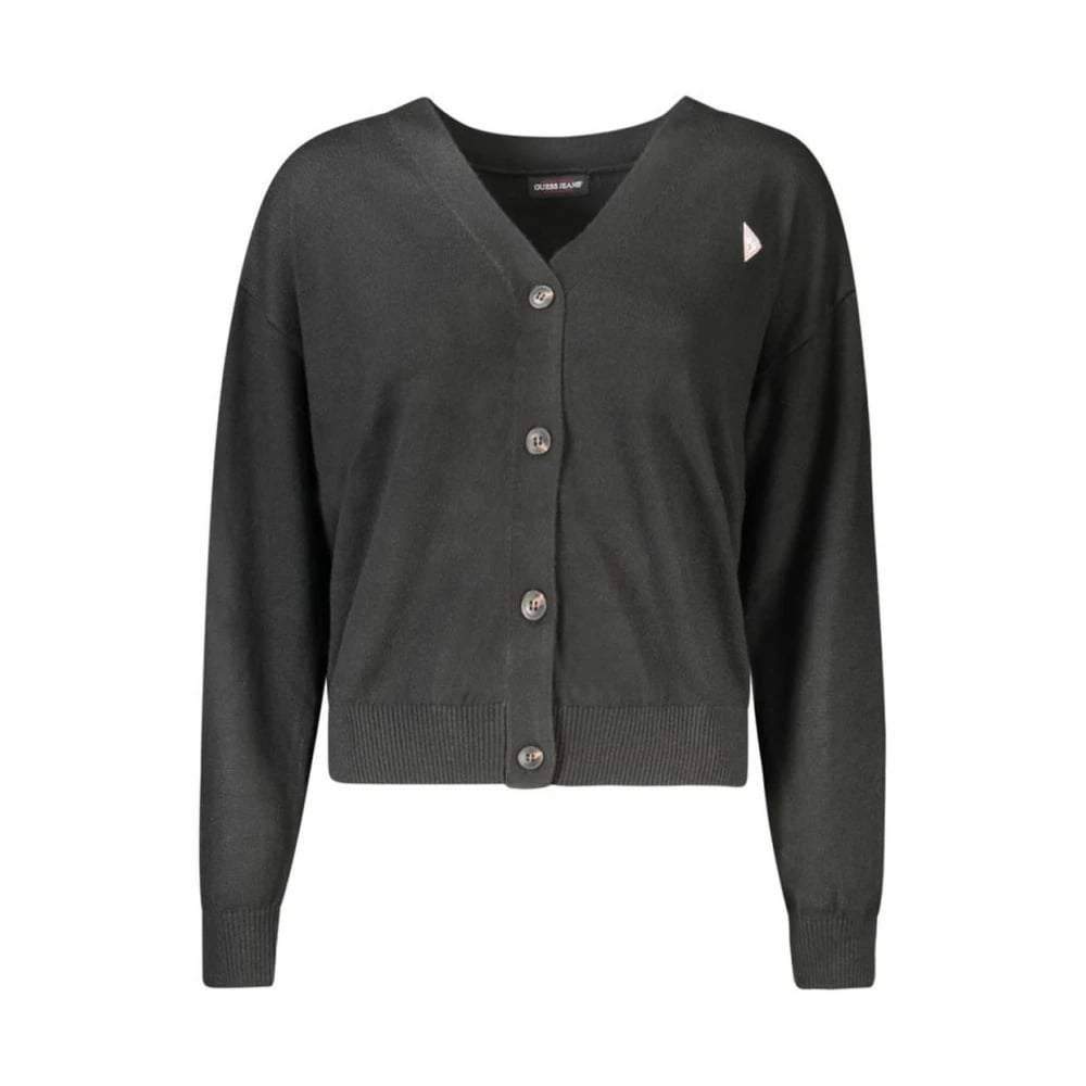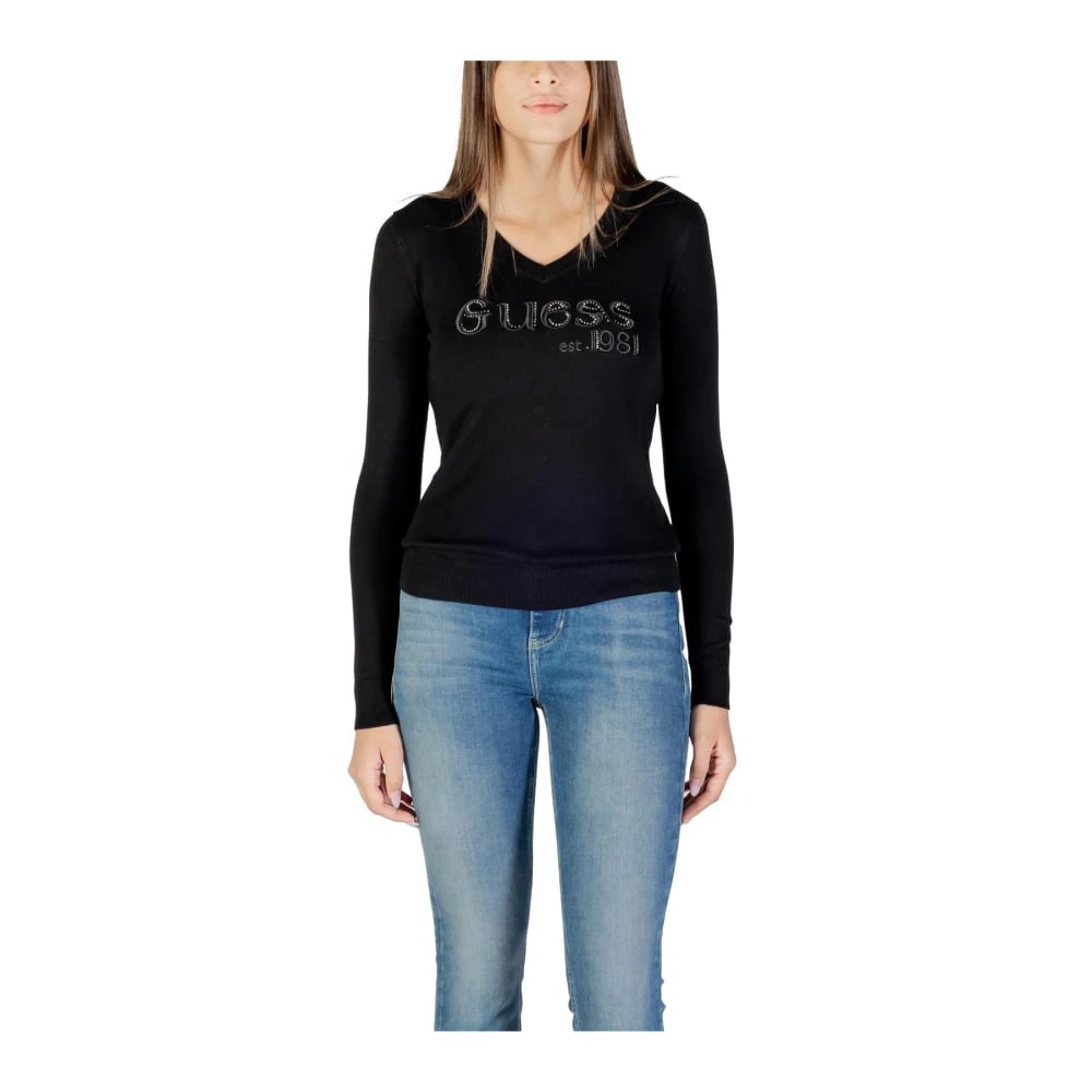 Guess, Stickade Tröjor , Dam, S, Polyester, Svart V-ringad tröja för kvinnor
