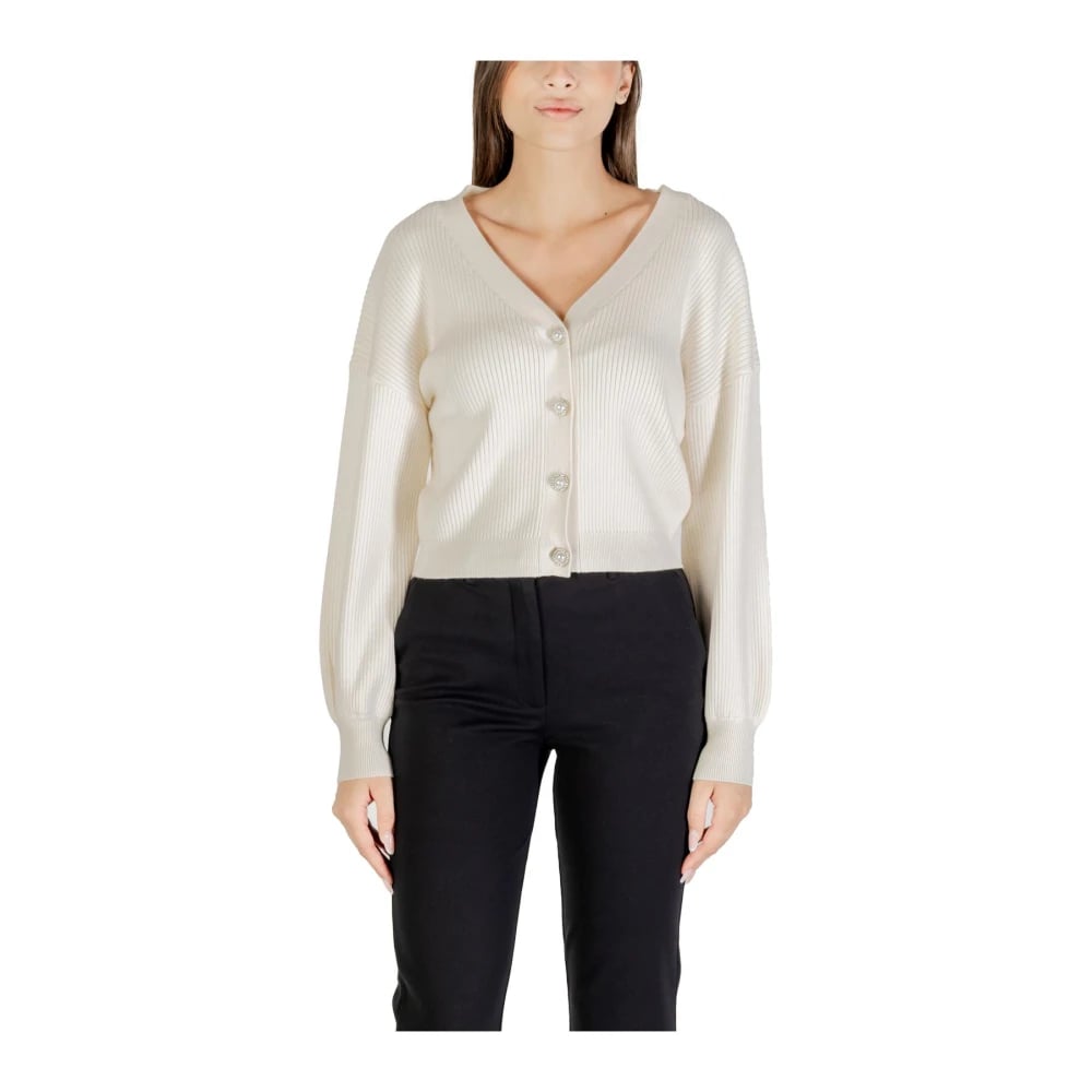 Guess, Stickade Tröjor , Dam, S, Polyester, Beige V-ringad kofta för höst/vinter