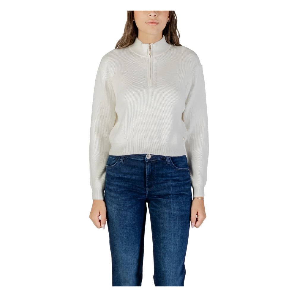 Guess, Stickade Tröjor , Dam, S, Vit Tröja med Dragkedja Krage