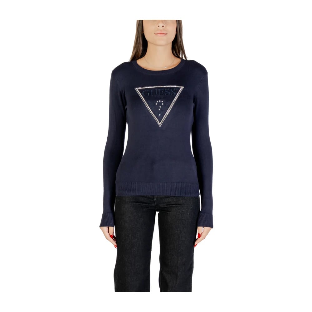 Guess, Stickade Tröjor , Dam, L, Blått Tryck Stickat med Strass