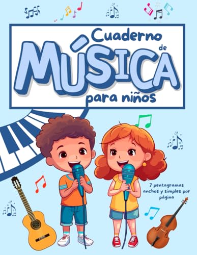Cuaderno de música para niños con 7 pentagramas grandes por página y 4 secciones de trabajo: Libreta escolar A4 más guía para el aprendizaje de ... tablaturas guitarra y anexos para colorear