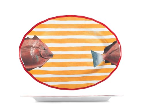 H&H, Marea oval tallrik, dekorerad melamin Ø 46 cm - vita och gula ränder, kant och dekor röd fisk - diskmaskinssäker