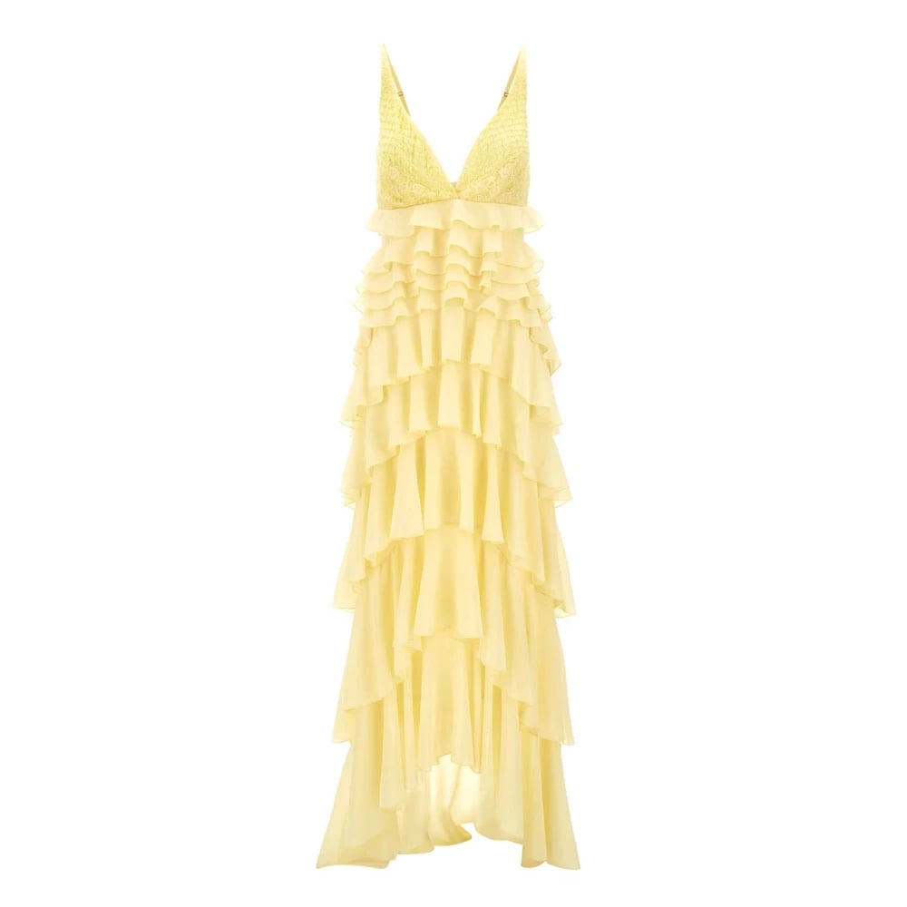 Elisabetta Franchi, Klänningar , Dam, S, Polyester, Gul Georgette Klänning med Spets och Kristaller