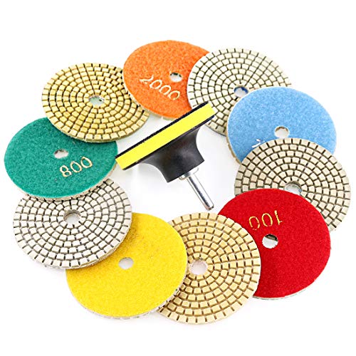 Swpeet 11 st diamantpoleringsdynor kit, 10 st 7,5 cm våt/torr poleringssats poleringsdynor kit med 1 st 7,6 cm gul bakplatta för granit marmor sten glas kvarts polering