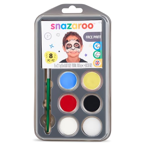 Snazaroo 1172213 sminkfärger set sommar, sminkpalett med pensel, svamp och instruktioner, 5 färger: svart, vit, röd, gul, blå