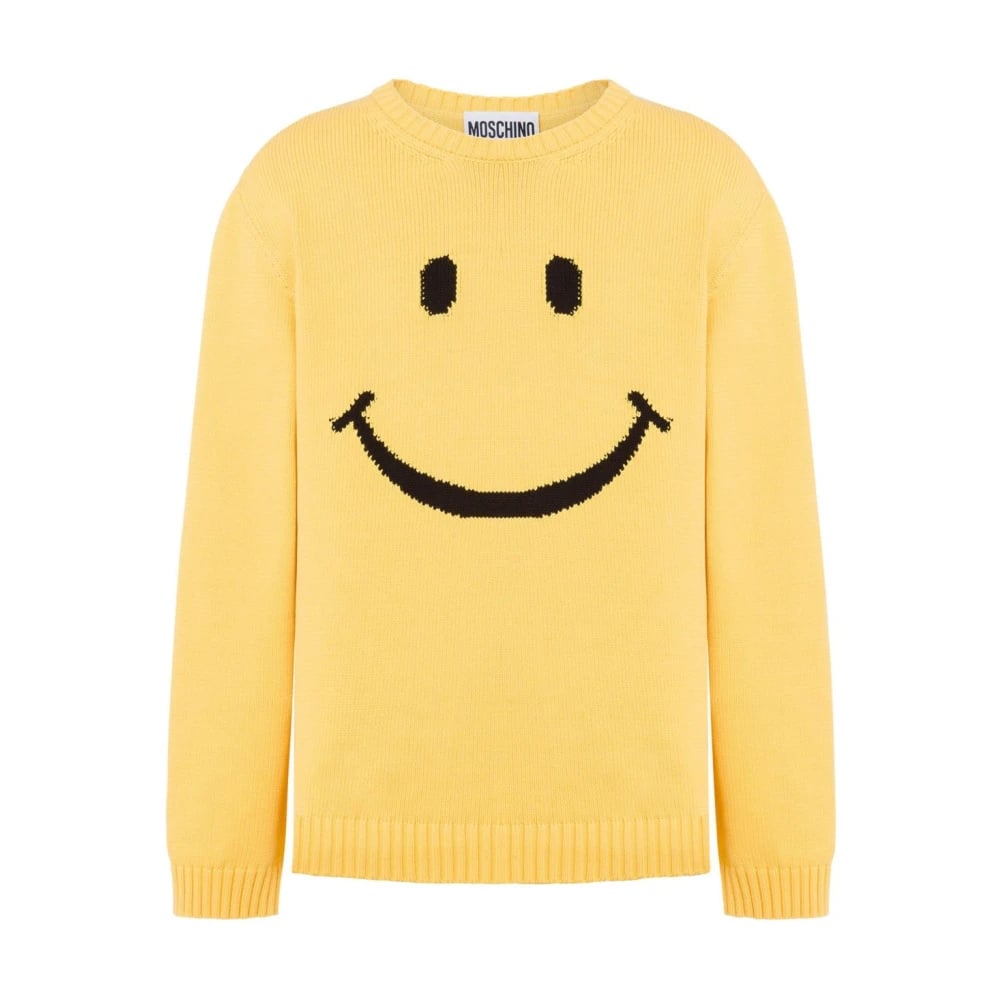 Moschino, Stickade Tröjor , Herr, M, Bomull, Gul Stickad Tröja med Smiley Ansikte