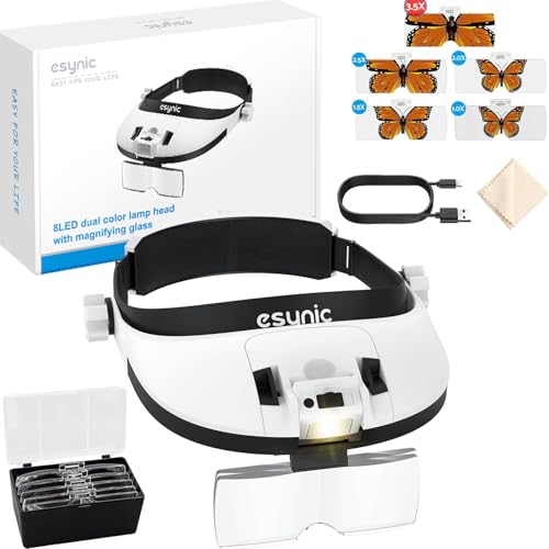 eSynic Pannbandsförstoringsglas med 8 lysdioder justerbar ljusstyrka, vit/gul/blandad, främre förstoringsglas 5 linser 1 x 1,5 x 2 x 2,5 x 3,5x, 900 mAh uppladdningsbart batteri, för smyckesreparation